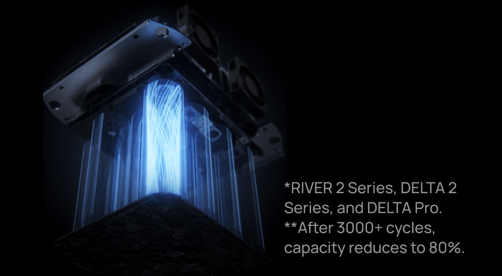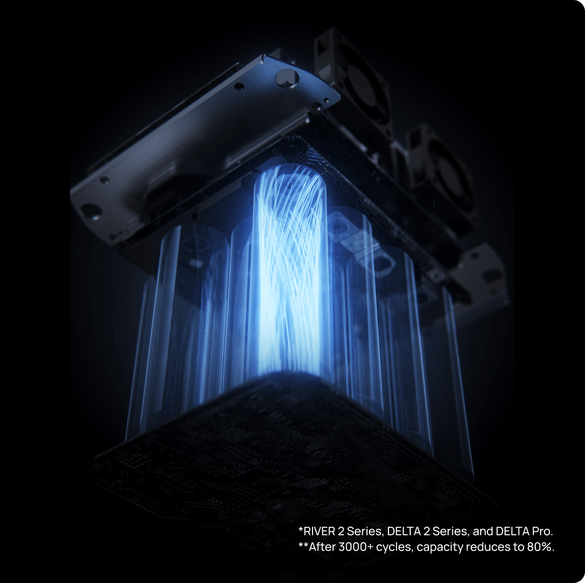 Depending on the model, EcoFlow portable power stations utilize lithium-ion (Li-Ion), NCM, or lithium-ion phosphate batteries (LiFePO4/LFP). Lithium-ion and NCM batteries are robust, but none more so than the LiFePO4s, which are powerful, fast charging, and last 4-5 times longer than lithium-ion batteries. LFPs are also a greener option and safer to run since they are cobalt-free. LFP batteries can last for 6500 cycles and achieve a depth of discharge rate of 100%, protecting users from over-discharging.