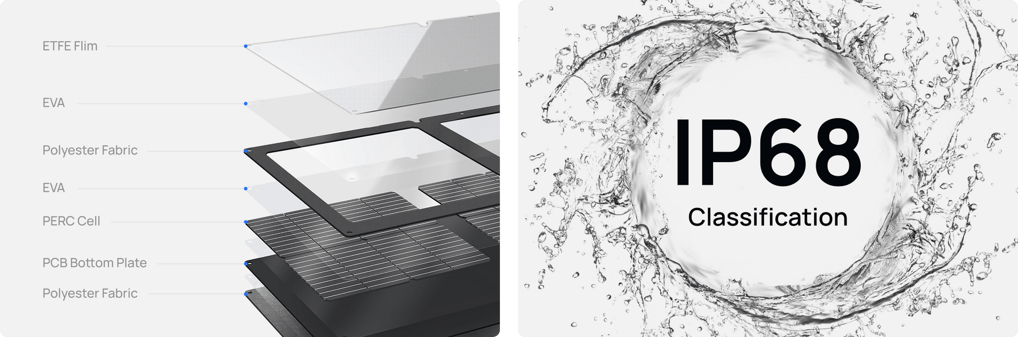 Our 60W portable solar panel is built to withstand a range of environments, from humid and wet to dry and dusty. With a high IP68 waterproof rating and a protective ETFE film, the solar cells continue to collect energy even during downpours.