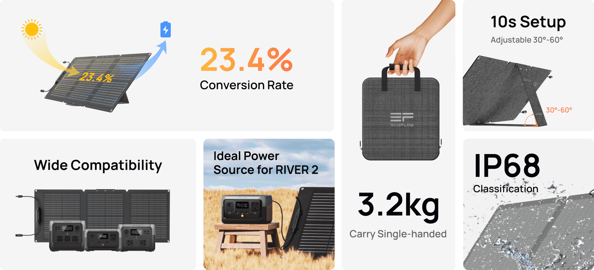 EcoFlow's RIVER 2 Solar Generator is a must-have for camping or RV trips. Our new 60W portable solar panel is the lightest and most convenient option available. With a weight of only 3.2kg and a folding design, it's easy to grab and go at any time.