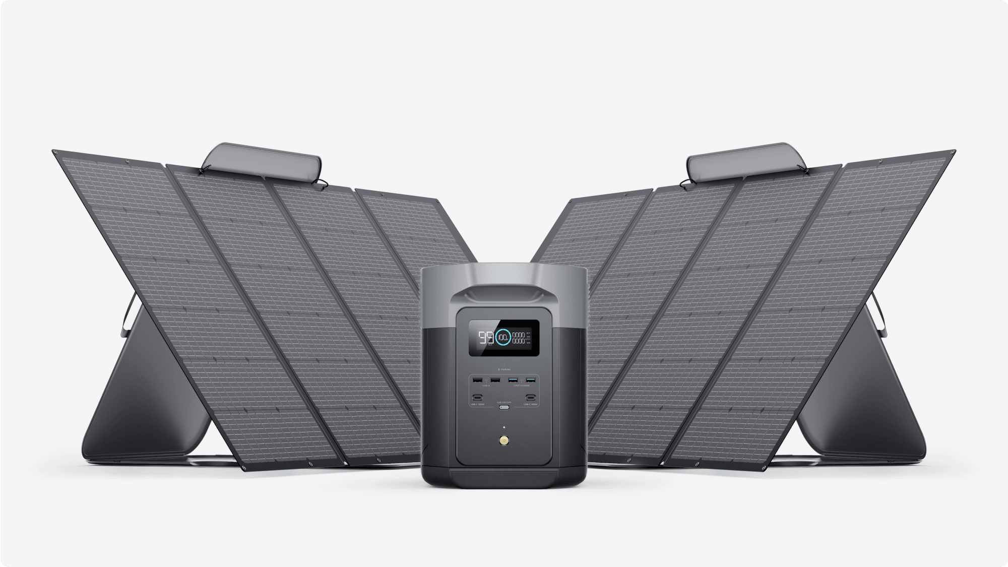 With a solar input of 1000W, fully recharged in 2.3 hours by connect up to 2 EcoFlow 400W Portable Solar Panels or 4 sets of 220W Bifacial Solar Panels.