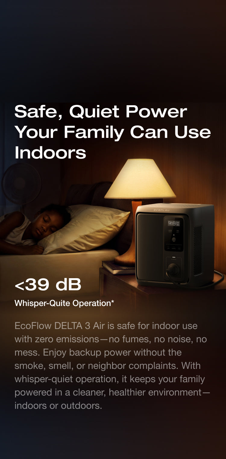 With its high-capacity design, the DELTA 3 Air series delivers long-lasting backup for your home essentials. From keeping a light on through the night to running fans and refrigerators during extended outages, it gives your family all-day peace of mind without interruption.