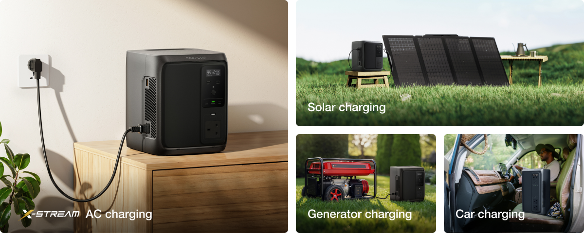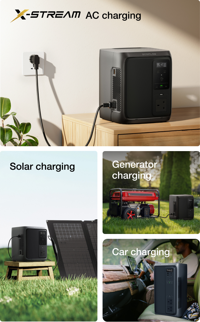 With EcoFlow’s X-Stream fast AC charging, DELTA 3 Air fully recharges in just 2 hours—ready before the next outage. For flexibility, you can also top up with up to 1000W of solar, or recharge via generator or car when off-grid.
